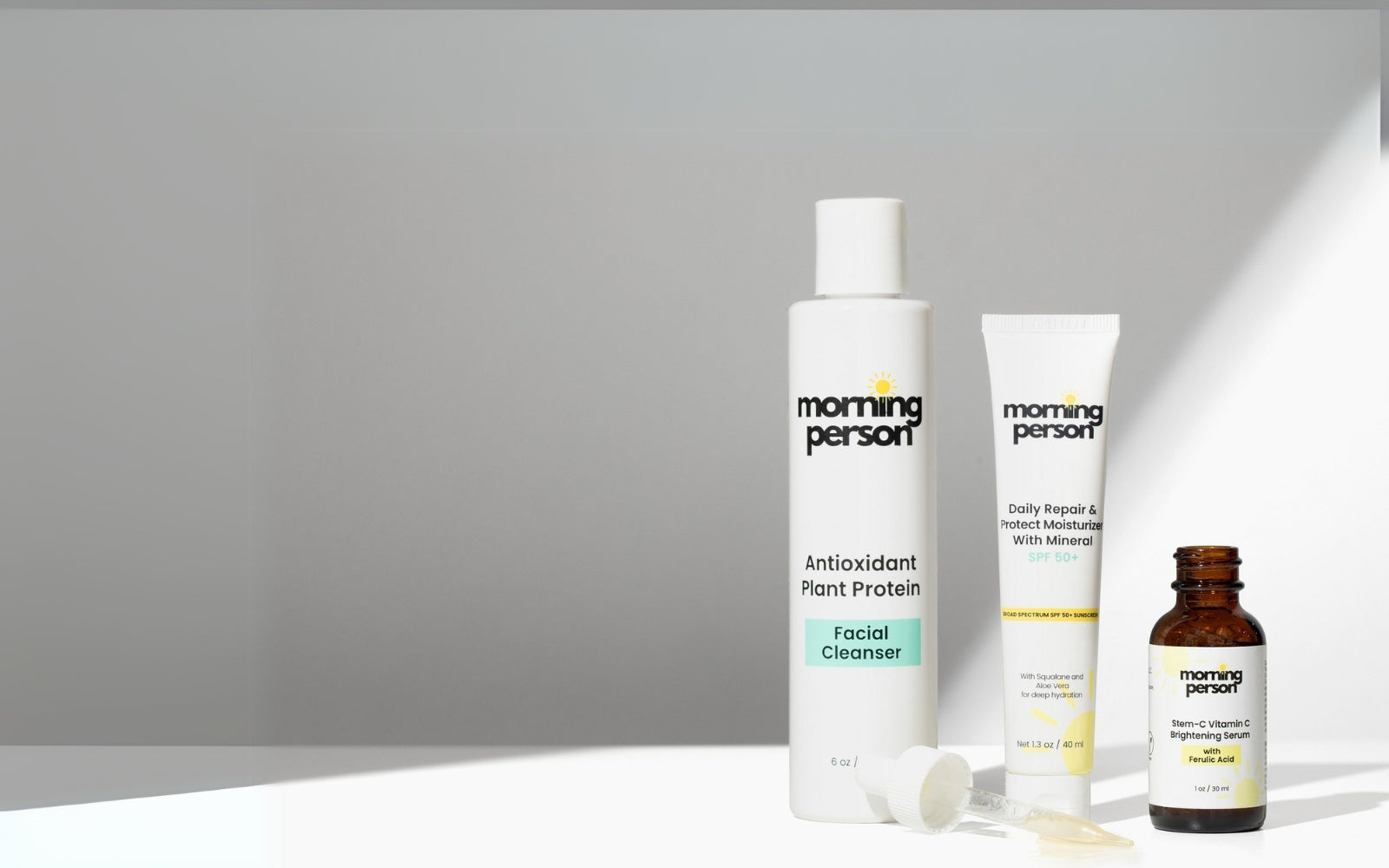 Here at Morning Person, we're passionate about keeping things simple. Our Morning Routine collection is all about brightening, preventing, and repairing your skin, all in one go. Fewer steps, more benefits - it's a win-win! Your skin will thank you, looking brighter, feeling more hydrated, and protected from the elements